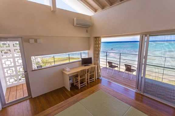 まるで海とひとつになったかのような、贅沢なロケーション。目の前にはリーフが広がり、両サイドには自然のままの白砂浜が続きます。そんな特別な景色を楽しみながら、琉球漆喰の壁、琉球畳のスペース、無垢材の床で仕上げたくつろぎの空間で、沖縄らしい安らぎを感じていただけます。