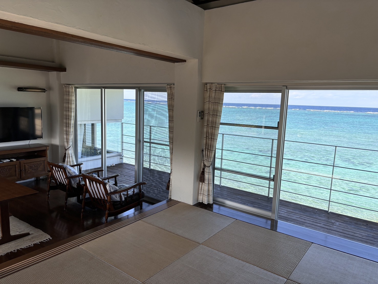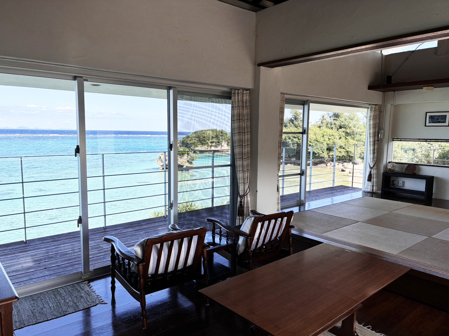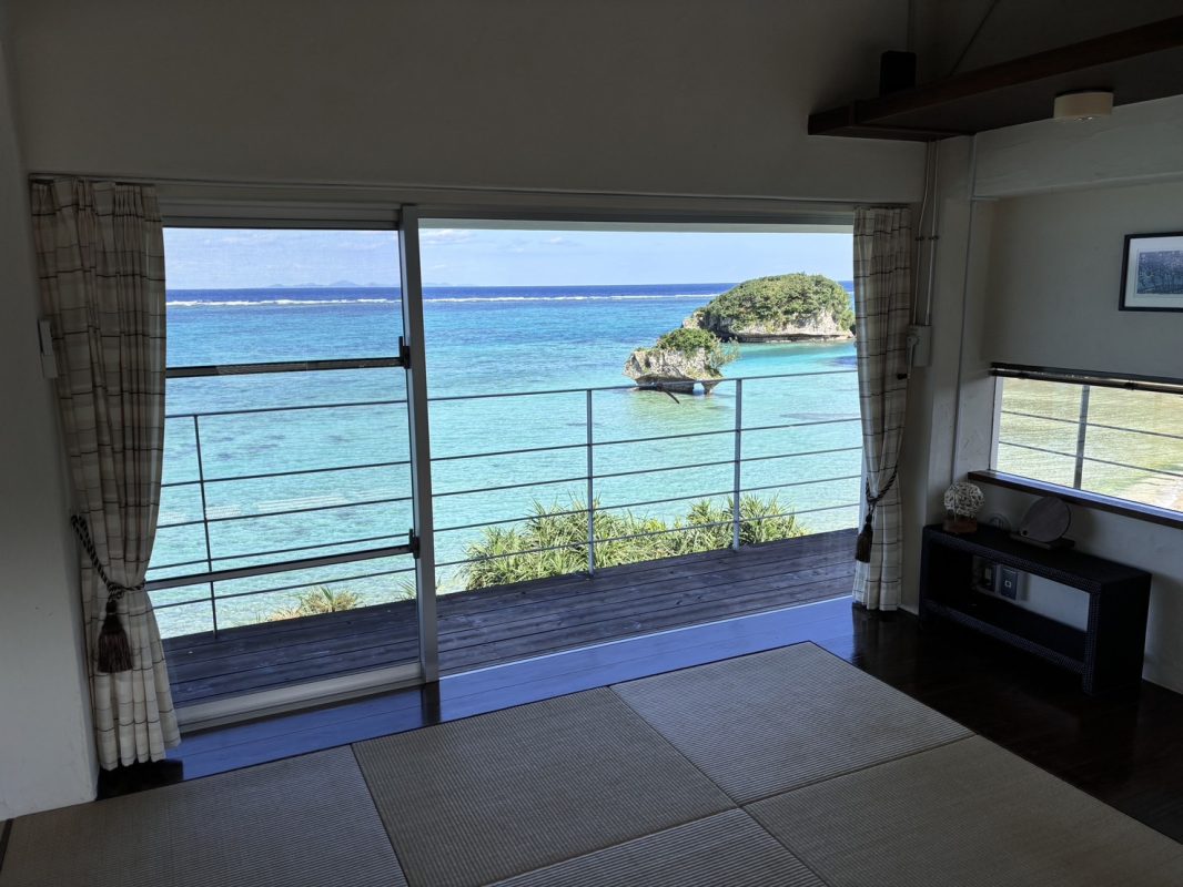 テラスからは180°広がる海が一望でき、まるで海の上に立っているような贅沢な気分を味わえるお部屋です。広々としたリビングと、仕切りのある琉球畳の和室。キッチンも備えており、日常の延長のようにゆったり滞在できます。琉球畳、漆喰の壁、無垢材の床に囲まれ、潮風と波音を感じながら、やんばるの大自然の中で心ゆくまでおくつろぎください。